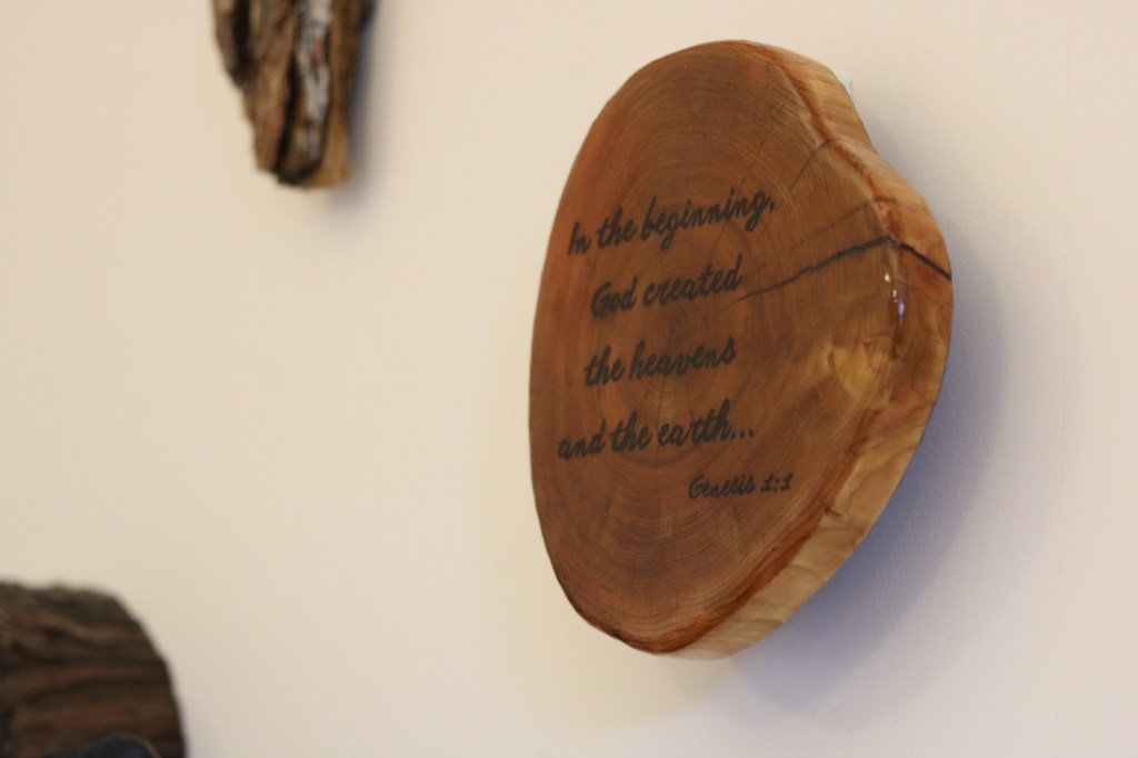Spiritually, I experienced an invitation to participate in the promise of 2 Corinthians 5:17: “So, if anyone is in Christ, there is a new creation: everything old has passed away; see, everything has become new!” The tree was cut, it had ‘passed away,’ but a ‘new creation’ was to be revealed, for this log was to have a new purpose in Christ. Our woodcraft business began because of Nathan’s profession as a tree surgeon, where he saw beautiful pieces of wood merely turned into chip; together we began to repurpose wood he brought home into creations that would instead continue to express the magnificence of God’s creation and the tabernacle would become such an explicit example of this.